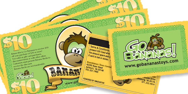 Over the years we've got to create tons of fun items for Go Bananas such as their logo design, stationary, web banners, t-shirts, wrapping paper, stickers, tags, reward cards, banana bucks, newspaper ads and more!